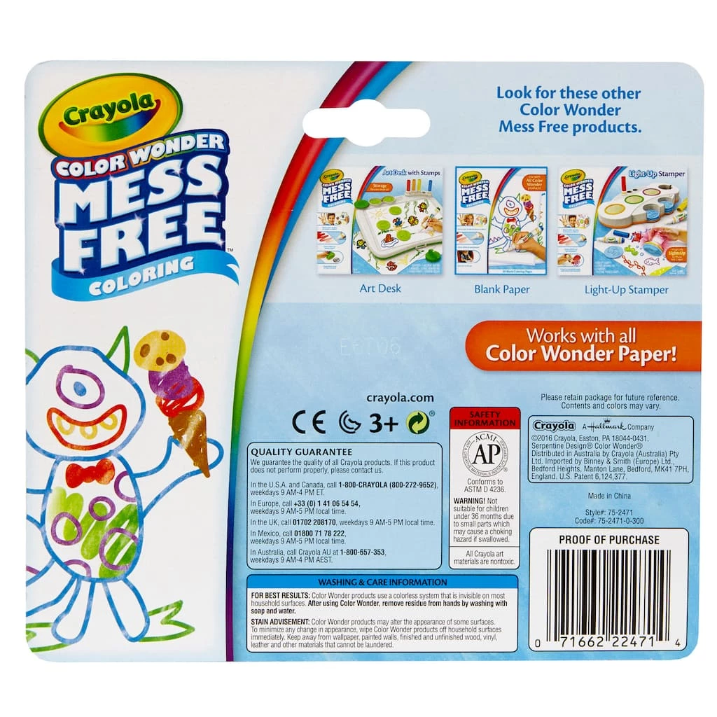 These Color Wonder Mess Free Markers are a great addition to Color Wonder art supplies already on hand. The Mini Markers in Classic Colors only color on special Color Wonder Paper (sold separately)—not on skin, clothing, or furniture. Great for at home or on the go, these Color Wonder Markers keep kids drawing and creating in a mess-free way.