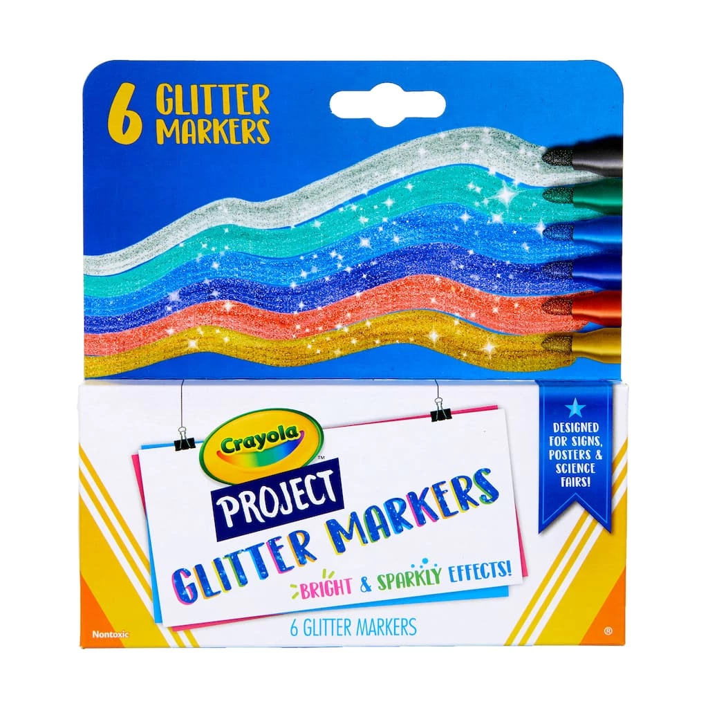 From the Crayola Project line, Glitter Markers add an extra dazzling touch to school projects, homemade cards, crafts, and colorful art projects. Works great on poster board, foam board, regular paper, and construction paper. This set includes 6 Glitter Markers that are great for both light and dark surfaces. Features 6 sparkly shades: Silver Sparkle, Emerald Zest, Blue Blazes, Violet Glitz, Fire Flecks, and Gold Medal.