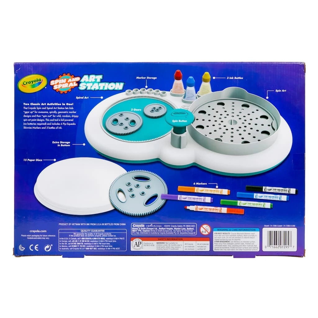 Two classic art activities in one! The Crayola Spin and Spiral Art Station lets kid “gear up” for awesome spirally geometric marker designs or “spin out” for wild, random drippy spin art paint designs. Create combo designs using both activities to elevate your art!