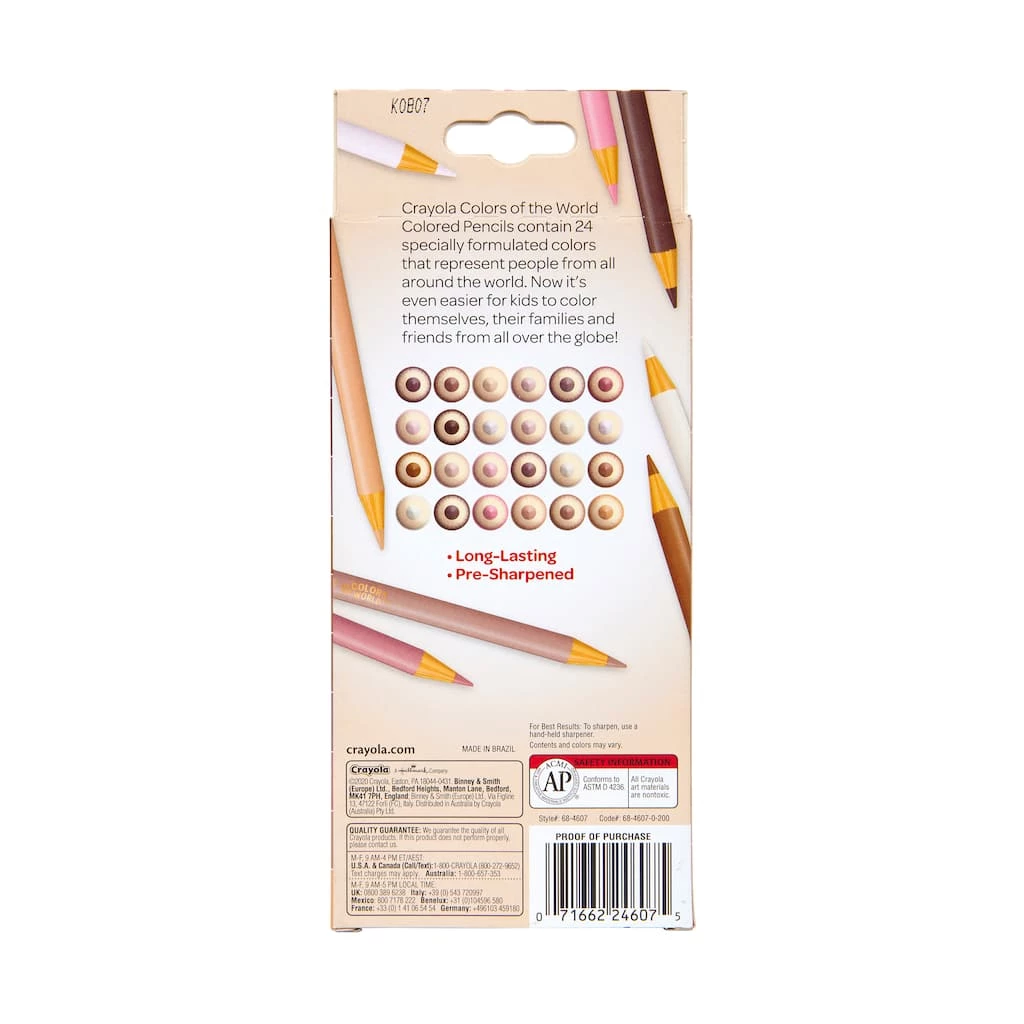 Crayola Colors of the World Colored Pencils contain 24 specially formulated colors representing people of the world. These skin tone colored pencils are an exciting addition to your collection, making coloring pages and drawings even more detailed and realistic. The subtle shades inside are formulated to better represent the growing diversity worldwide. Colors of the World fall into three main shades: Almond, Golden and Rose and all the darker or lighter shades in between. This pack includes 24 new pencil colors that represent people from around the world. Pair with Crayola Coloring Books or pick up Colors of the World Crayons!