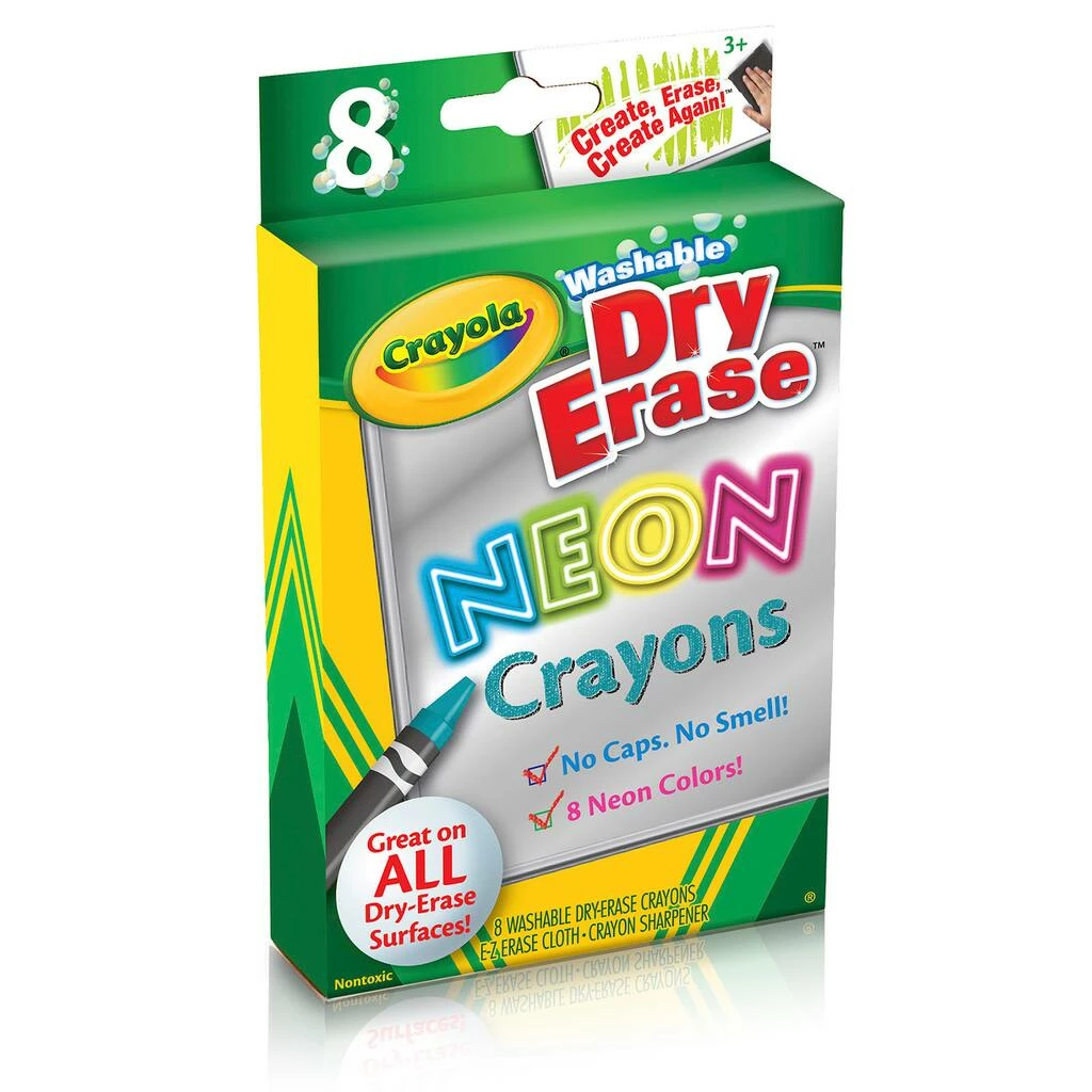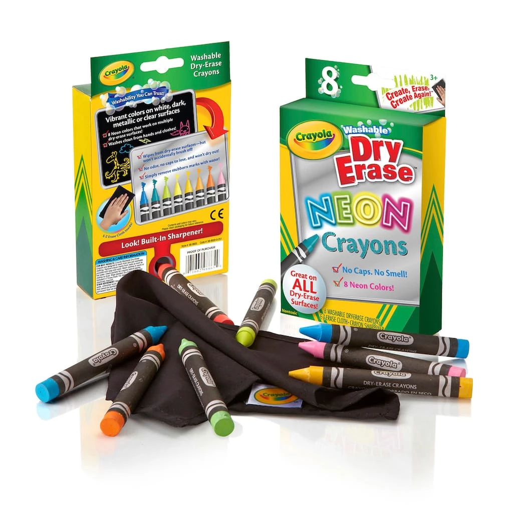 This pack of crayons includes neon colors that show up strikingly on whiteboards and other dry-erase surfaces. Whether you want to create an eye-catching sign or just want to doodle, these crayons are great for all sorts of artistic applications. And thanks to the included sharpener, you’ll always have a fine, pinpoint nub to draw with. Crayola Dry Erase Crayons are fully washable and do not stain clothes, or skin, so parents can have peace of mind while their children draw. Tougher marks can easily be washed away by hand using just water.