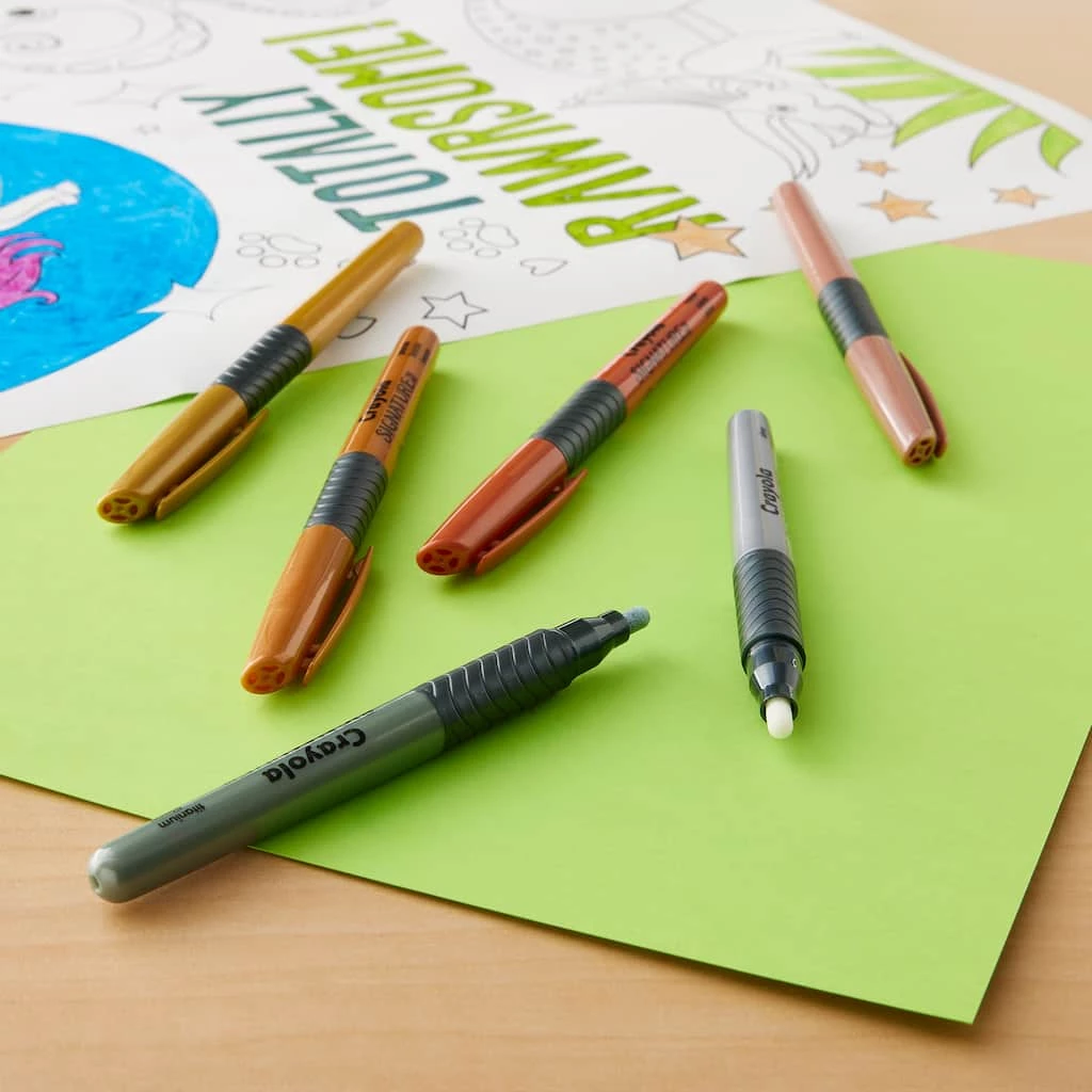 Crayola Signature Liquid Metal Permanent Art Markers add an extra sleek sheen to school projects, hand lettering, homemade cards, crafts, and other colorful art projects. Works great on poster board, foam board, regular paper, construction paper, wax paper, cardboard and even wood! Includes 6 Permanent Markers with paint-like inks and a liquid metal shine. Included colors are Gold, Rose Gold, Silver, Bronze, Copper, and Titanium.
