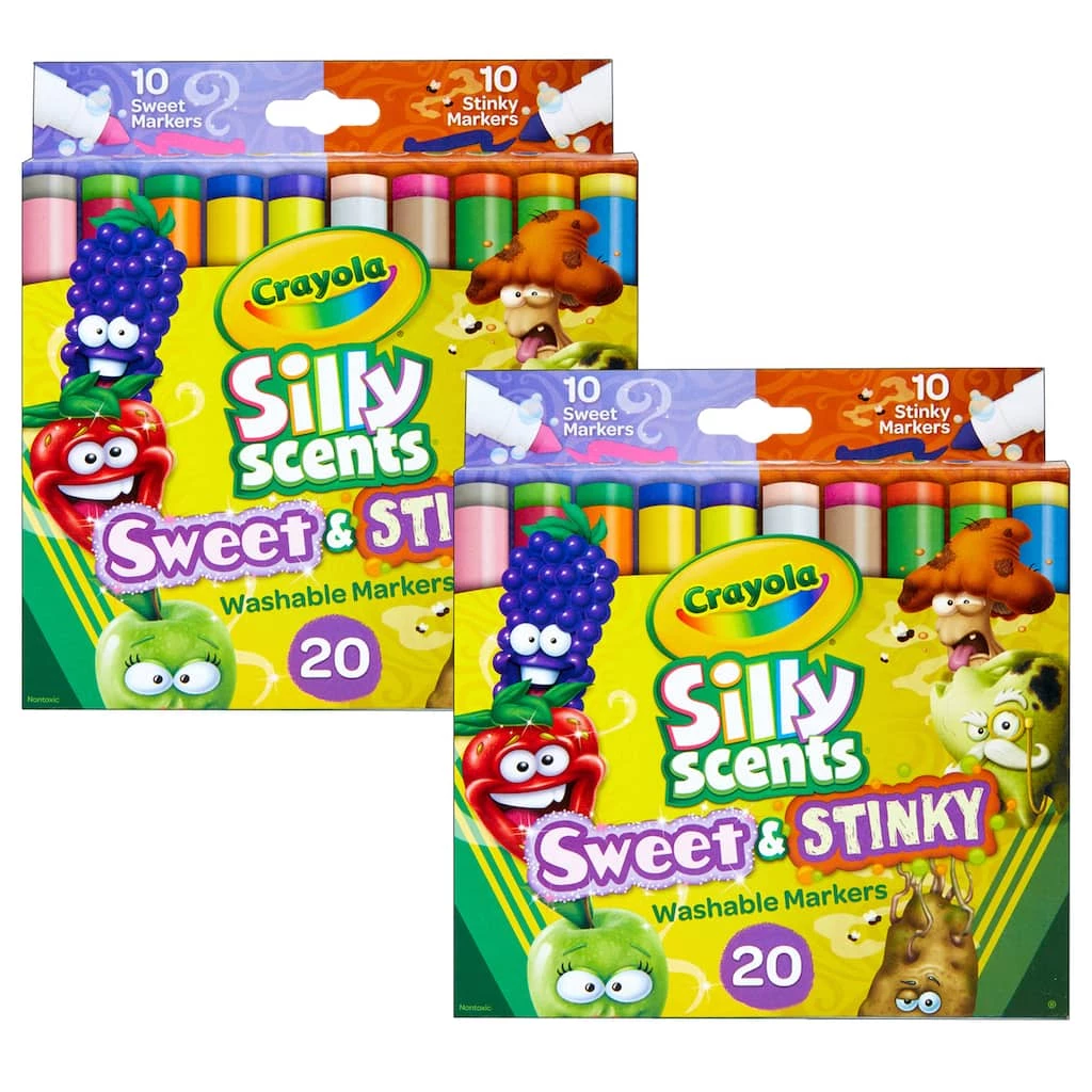 Crayola Silly Scents Broad Line Markers, Stinky & Sweet Edition are a mashup of fine- and foul-smelling marker inks that kids will love! Kids can smell sweet aromas, including Coconut, Green Apple, Grape, Strawberry, Banana, Lime, Blueberry, Watermelon, Orange, and Lemon. Then they can be totally grossed out by Mushroom, Pizza, Onion, Dirty Potatoes, Old Rotten Tooth, Rotten Fruit, Cheese, Garlic, Pickle, and Smoke. But donโt worry, the smells wonโt linger and neither will stray marks as these markers are washable from skin and most washable clothing. Great aromatic fun for kids.