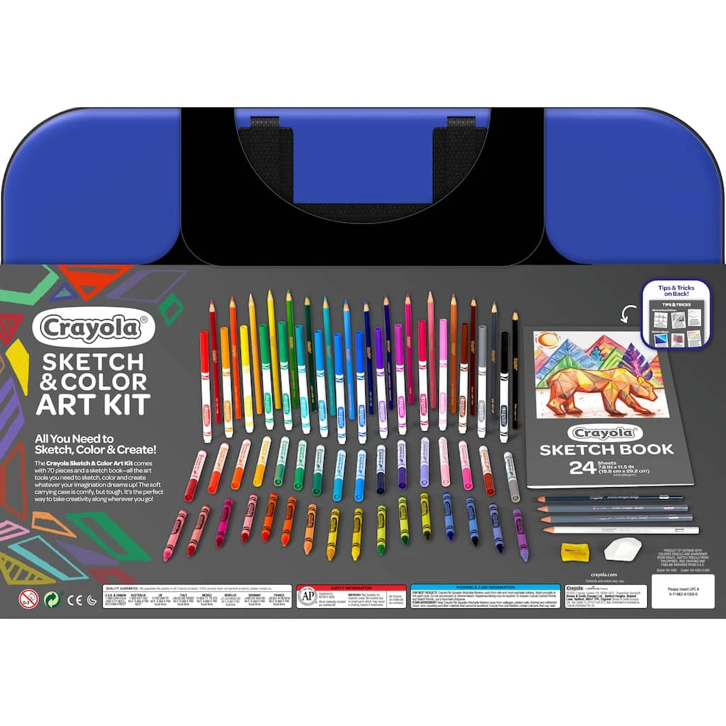 Featuring over 85 pieces, the Crayola Sketch & Color Art Kit has all you need to draw, color and create wherever you go! Inside the sleek, soft shell case youโll find 16 crayons, 16 colored pencils, 4 sketch pencils, 16 fine line markers, 16 Pip Squeaks Skinnies markers, 1 sharpener, 1 easer and a 12-page sketchbook. Thereโs even a guide so budding artists can practice advanced coloring and sketching techniques. The Sketch & Color Art Kit makes a perfect gift for holidays, birthdays and every occasion in between! Ideal for boys and girls and artists of all ability levels, ages 8 and up.