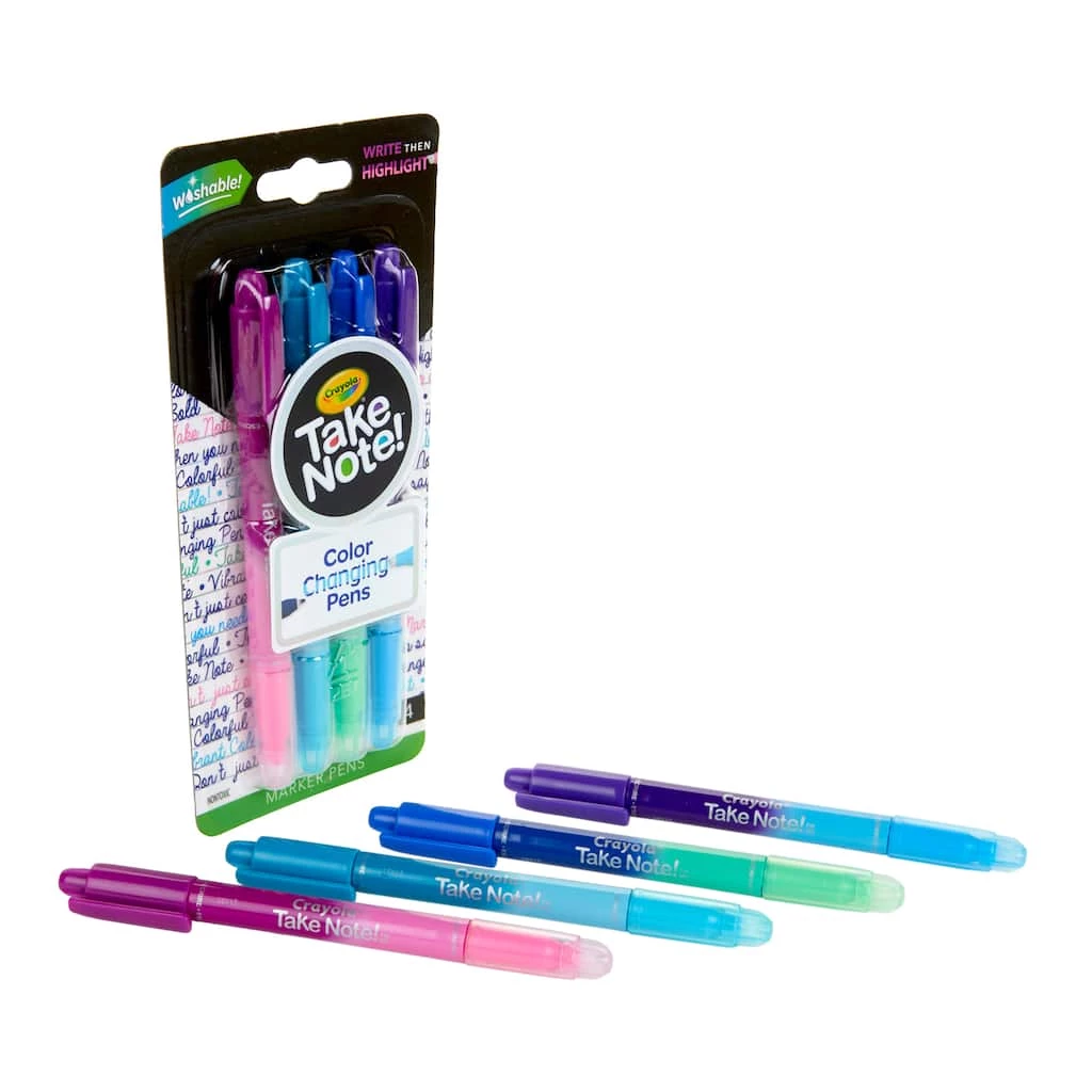 Donβt just cover, change the color with 4 Take Note dual-ended Color Changing Pens. Each pen is equipped at one end with a Felt Tip Marker and the other with a clear, color changing Chisel Tip. Precise details are easy with felt tip pens. And if you want to change the color, just flip to the other tip and apply the clear ink and watch the magic happen! Color-changing inks wash easily from skin and clothing. They are the perfect fun and functional note taking supplies for the classroom, office, and more. Ideal for teens and adults.