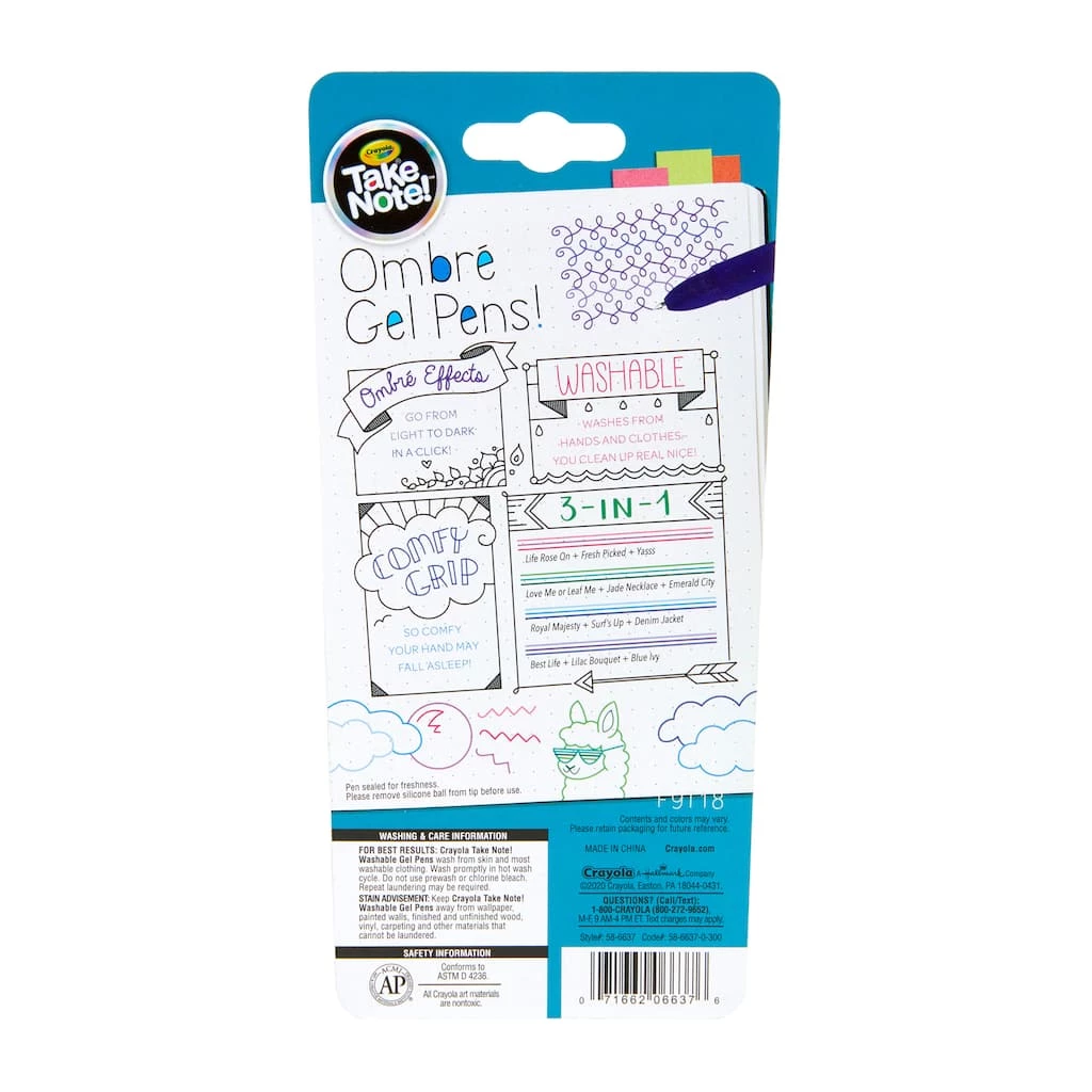 Crayola Take Note Ombre Washable Gel Pens go from light to dark in a click! Each of the 4 gel pens in this set features 3 different shades so you can create gradient, shading effects with just one pen! Add ombre effects in journals, notebooks or any writing projects. And the inks wash clean from skin and clothing so thereโs no worry. Take Note items are fun and functional note-taking supplies that are perfect for classroom, office, and more. Ideal for teens and adults.