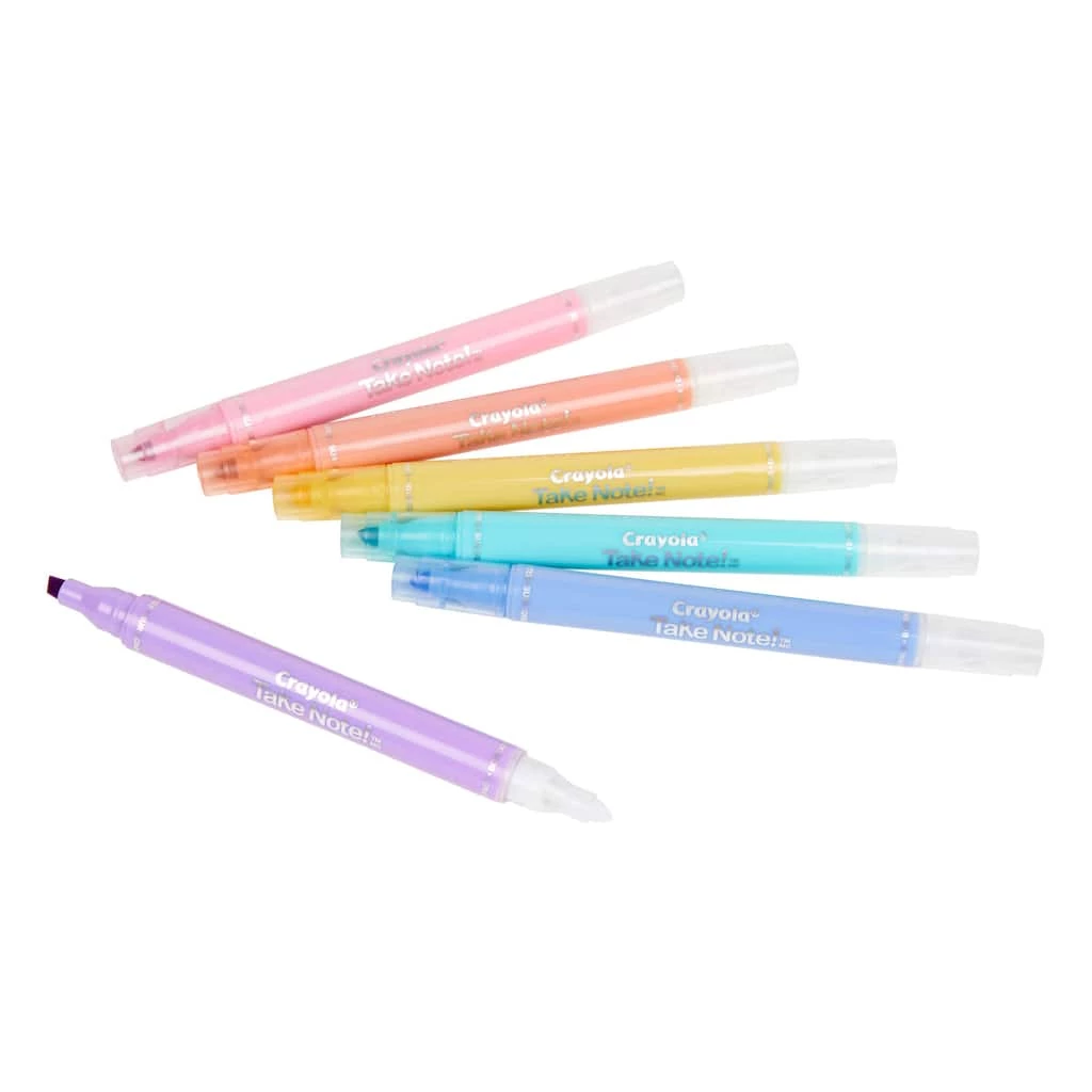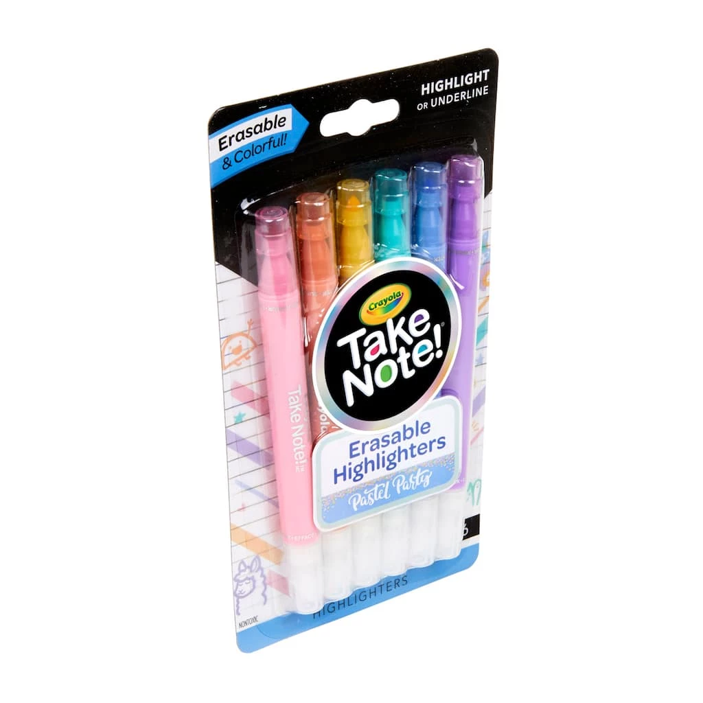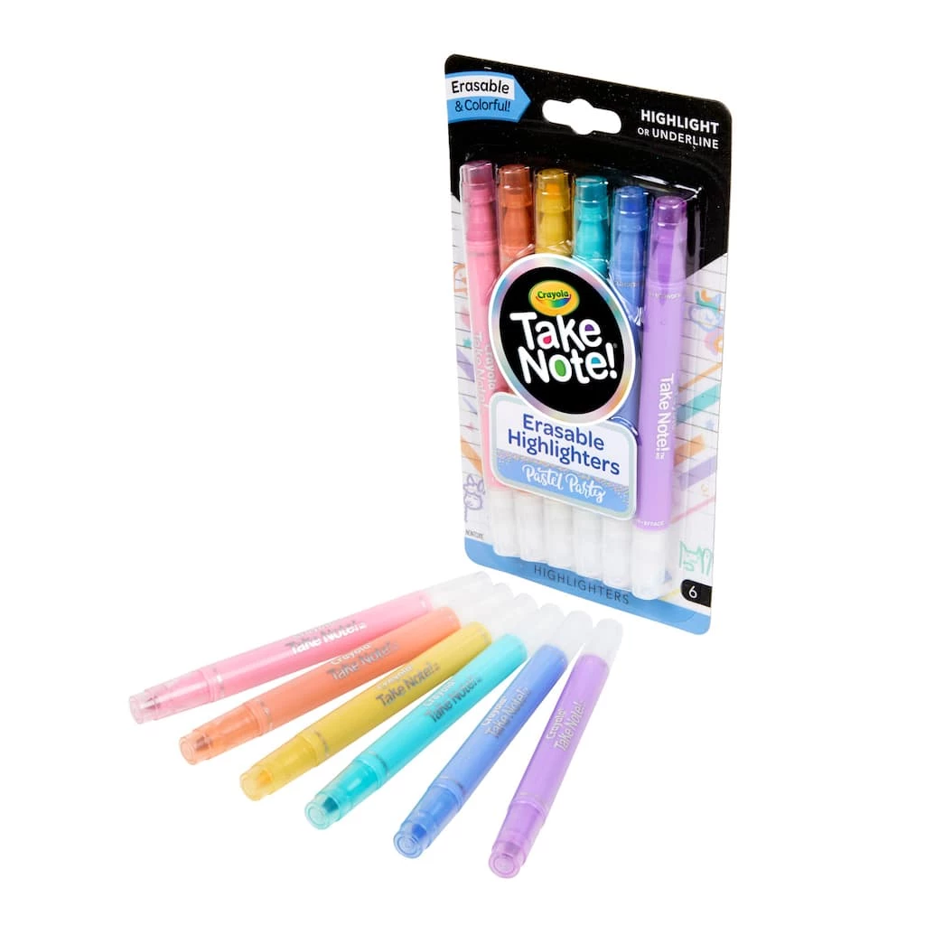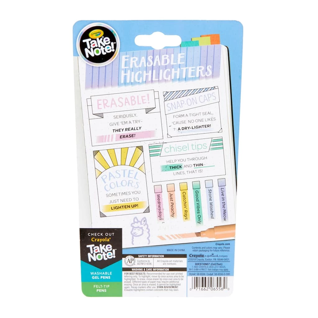No textbook is off limits with Crayola Take Note Erasable Highlighters. Highlight where you want to, and erase where you wish you didn’t! This Take Note Highlighter set features 6 Erasable Highlighters in fun pastel colors. Featured highlighter colors include Wednesdays (Pink), Just Peachy, Catchin’ Rays (Yellow), Good Vibes Only (Green), Stone Washed (Blue), and Live in the Meow (Purple). Crayola Take Note art supplies offer fun and functional note taking supplies for the classroom, office and more.