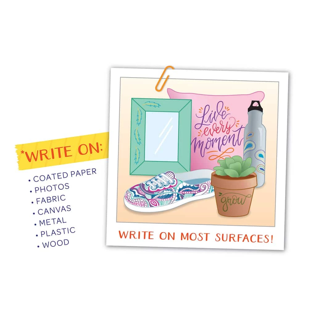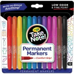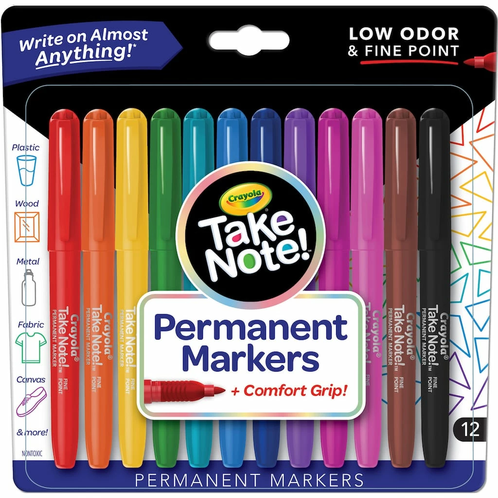 Markers with staying power! Make a statement and make it last with this vibrant set of Take Note Permanent Markers. With 12 primary and secondary colors to choose from, you’ll have a rainbow of options at your fingertips. Plus, each marker has its own unique Crayola color name listed on the barrel. Use them on coated paper, photos, clothes, or canvas sneakers they even work on metal, plastic, wood or glass! Permanent markers are ideal for crafting projects both at home and in the classroom. With a comfort grip, versatile tip, and quick dry ink, these art supplies are soon to become your favorite writing and drawing tools. Recommended for ages 14 and up.