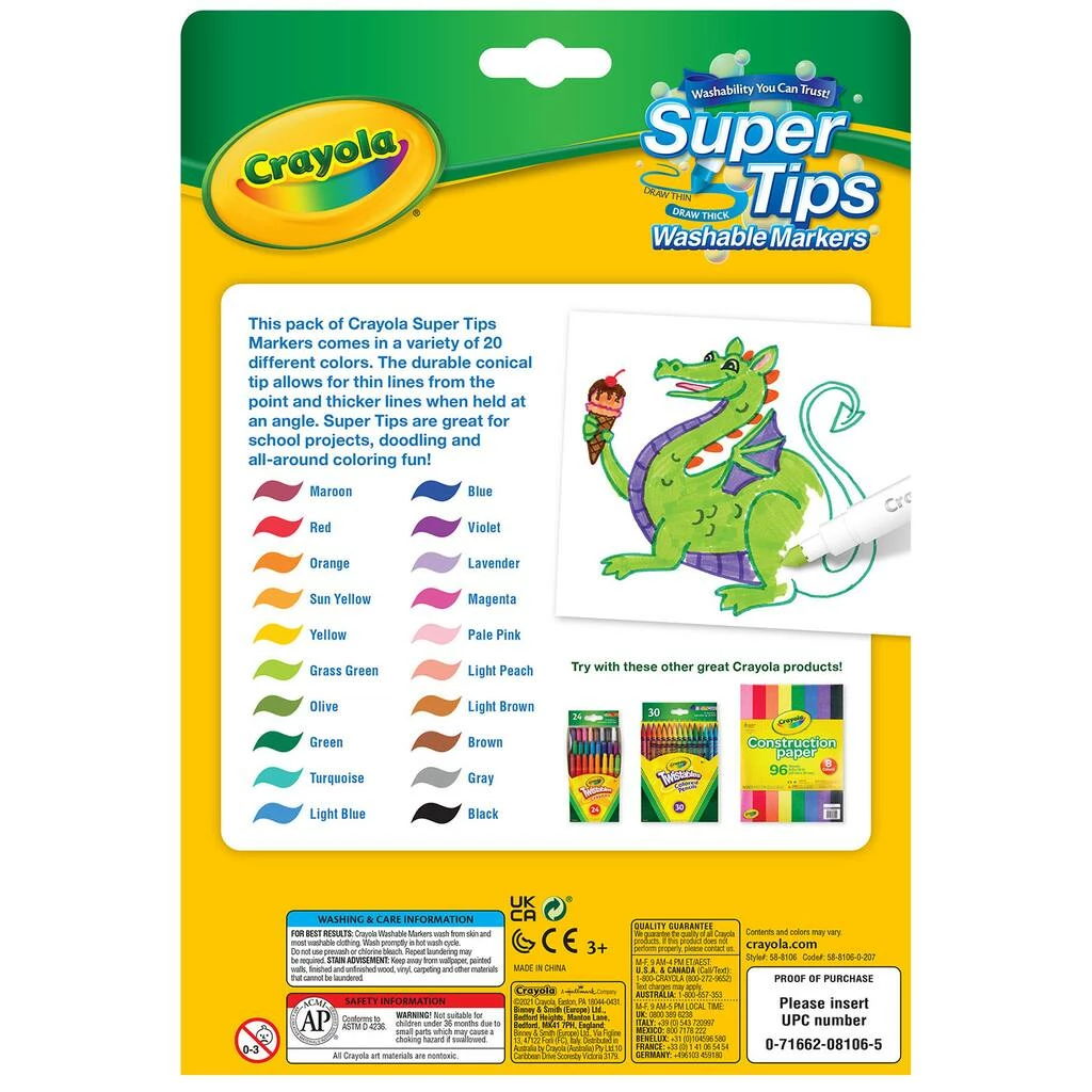 Washable Super Tips Markers feature a versatile tip that draws both thick or thin lines. Crayola’s washable ink is specially formulated to easily wash from skin and most children’s clothing. Super Tips markers have a unique, durable tip that is smooth, not scratchy. Use the side for coloring in large areas and the tip for adding details. Super Tips are great for school projects, doodling, and coloring fun.