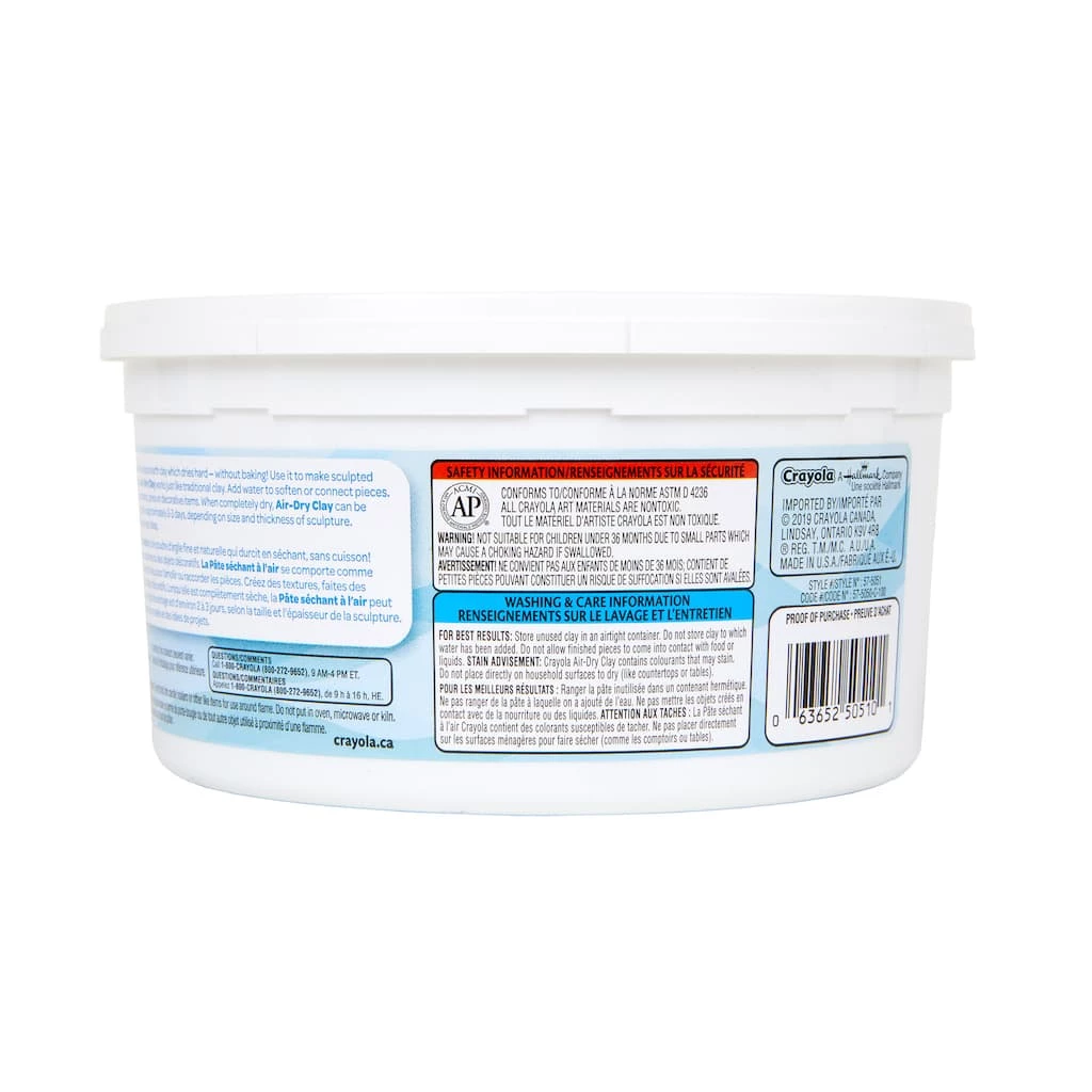 Crayolaยฎ Air Dry Clay in the 2.5lb bucket allows your little ones to create fun and imaginative shapes with ease. This soft modeling material can either be reused or air dried to preserve your creation. No baking is ever required. Smoother, finer, and less sticky than traditional clay, this Crayola Modeling Clay is perfect for group activities. You can even soften the clay with water if needed, allowing kids to enjoy hours of fun making and re-making favorite creations. Once your child is finished creating, let their creations dry. Once dry to the touch, they can be painted with Crayola Paint (sold separately). Safe and nontoxic, ideal for children ages 6 and older.